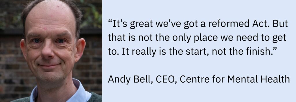 The evidence of that gap is visible across the pathway. Use of the Act has increased, while disproportionality, particularly affecting Black communities, remains stark. Many people describe experiences of crisis care, especially in inpatient settings, as frightening or even traumatic.